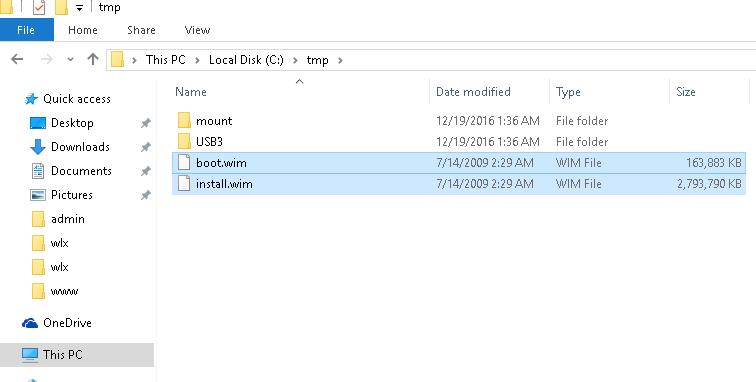 Next, you need to integrate your drivers into the Windows 7 installation image (it may be an ISO file or a ready image copied to the installation USB stick). You need to copy two WIM files from the ISO image or Windows 7 installation media to the local c:\tmp directory on your drive.