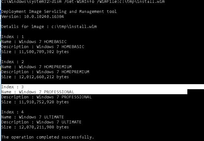 In our example, there are 4 different Windows editions in the install.wim image. We’ll add the USB 3.0 driver to Windows 7 PROFESSIONAL with the index 3 (this number will be used to address the edition in the DISM commands).