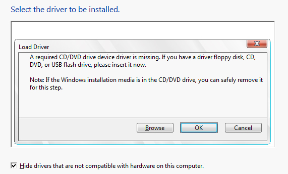 A required CD/DVD drive device driver is missing. If you have a driver’s floppy disk, CD, DVD, or USB flash drive, please insert it now. Note: If the Windows installation media is in the CD/DVD drive, you can safely remove it for this step.