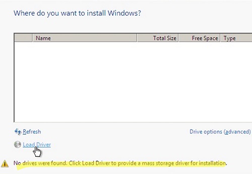 No drives were found. Click Load Driver to provide a mass storage driver for installation.
