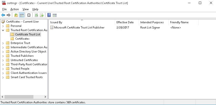 A Certificate Trust List (CTL) is simply a list of data (such as certificate hashes) that is signed by a trusted party (by Microsoft in this case). The Windows client periodically downloads from Windows Update this CTL, which stores the hashes of all trusted root CAs. It should be understood that this CTL doesn’t contain the certificates themselves, only their hashes and attributes (for example, Friendly Name). Windows devices can download a trusted certificate from Certificate Trust List on demand.