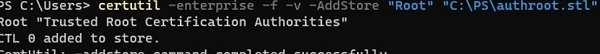 root "Trusted Root Certification Authorities" CTL 0 added to store. CertUtil: -addstore command completed successfully.
