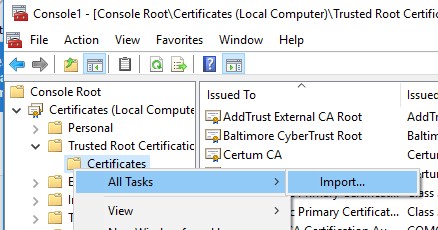 Then expand the +Trusted root certifaction authory folder, select certificates, right click all task -> import, choose the SST file create before, press the browse button and chose the Trusted root certification authority from the list. Finish.