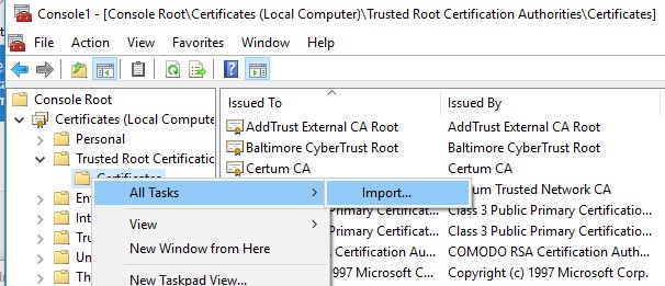 - You can import this certificate on another computer using the option All Tasks -> Import.