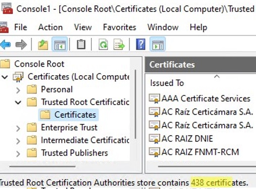 Run the certmgr.msc snap-in and make sure that all certificates have been added to the Trusted Root Certification Authority. In my example on Windows 11, the number of root certificates increased from 34 to 438.