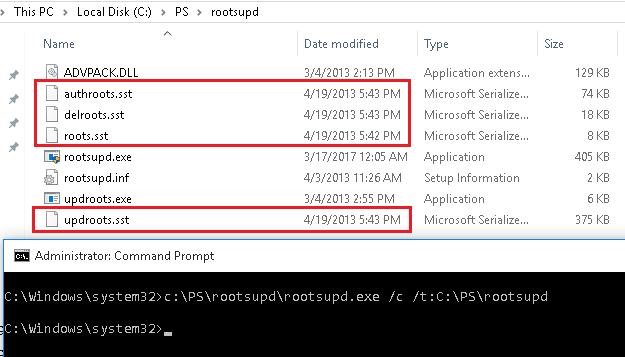 rootsupd.exe /c /t: C:\PS\rootsupd - Certificates are stored in SST files, like authroots.sst, delroot.sst, etc. To remove or install certificates, you can use the following commands:
