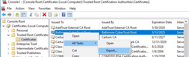 - You can export any certificate to a .CER file by clicking on it and selecting All Tasks -> Export;