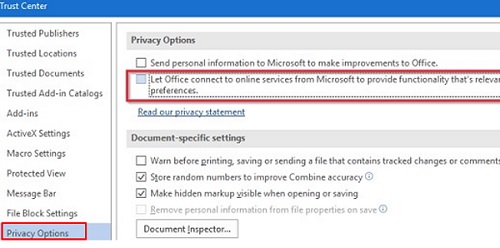 - Uncheck the option Let Office connect to online services from Microsoft to provide functionality that’s relevant to your usage and preferences. In Outlook 2013, this option is called Allow Office to connect to the Internet;