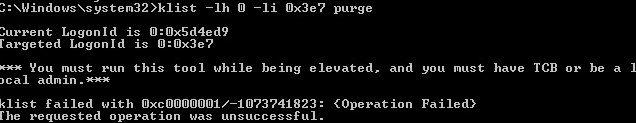 klist -li 0: 0x3e7 purge command, you can get an error: “Error calling API LsaCallAuthenticationPackage”:Current LogonId is 0:0x3d2de2
