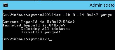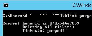 Current LogonId is 0:0x5e3d69 Deleting all tickets: Ticket(s) purged!