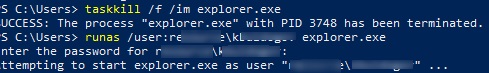 taskkill /f /im explorer.exe - Start a new Explorer process using your account credentials. You can use the