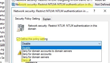 - Disable: the policy is disabled (NTLM authentication is allowed in the domain);
