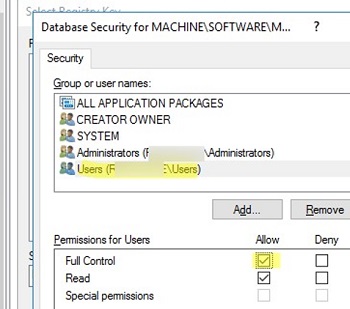 MACHINE\SOFTWARE\Microsoft\Windows\CurrentVersion\DriverSearching); - Set the new ACL settings for your registry key that you want to apply in the Database Security window. In this example, I want to allow users to make any changes to the system-protected registry key. You need to select the Users group and grant Full Control permission for it. You can enable the inheritance of permissions to the sub-keys by using the Advanced -> Enable inheritance option; You can add or remove any other security groups, users, and other principals from the local computer or Active Directory.