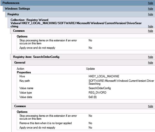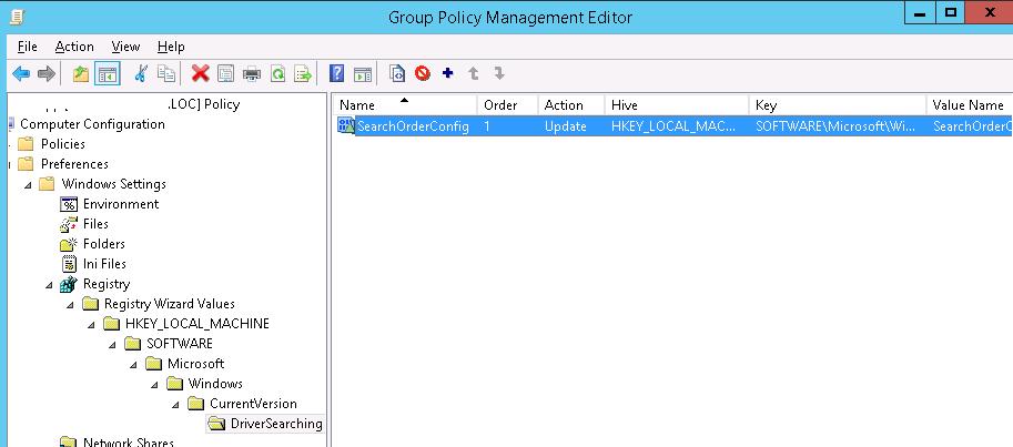 Action: Update Hive: HKEY_LOCAL_MACHINE Key Path: SOFTWARE\Microsoft\Windows\CurrentVersion\DriverSearching Value name: SearchOrderConfig Value type: REG_DWORD Value date: 00000000