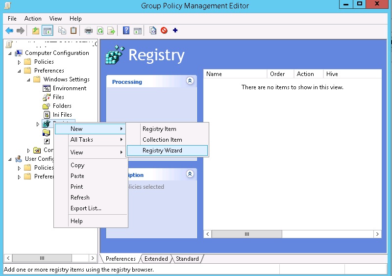 - Expand the GPO section Computer (or User) Configuration -> Preferences -> Windows Settings -> Registry and select New -> Registry Wizard in the context menu;