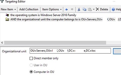 - Item-level targeting – allows you to more accurately target policy to clients (you can target the policy to a specific IP, network mask, computer name, or computers with certain characteristics, similar to how you use WMI filters in GPO). For example, you can specify that the registry parameter should be applied to computers running Windows Server 2016 in the AD OU named Servers.