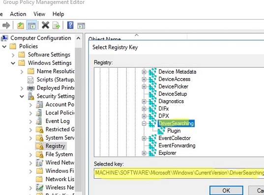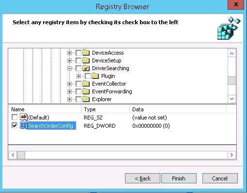 Suppose, you want to disable the automatic driver update on all computers in a specific Active Directory OU (Organizational Unit). In order to do this, you will need to change the value of the registry parameter SearchOrderConfig in the reg key HKEY_LOCAL_MACHINE\SOFTWARE\Microsoft\Windows\CurrentVersion\DriverSearching. You can configure a registry setting on target computers in the domain in two ways: using the built-in GPP Registry Browser, or manually by specifying the path to the registry key, the parameter name, and the value.