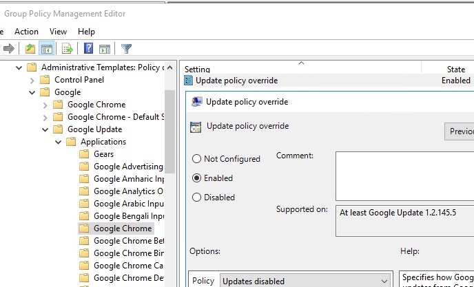 - Disable Chrome auto-update: Chrome -> Google Update -> Applications -> Google Chrome: Update Policy Override: Updates disabled;