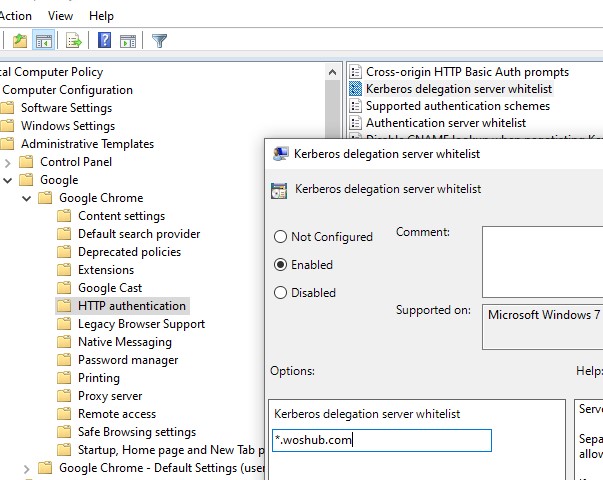 - Allow Kerberos authentication in Chrome for specific sites. Add a list of servers and site addresses to the policy settings under HTTP Authentication -> Kerberos Delegation Server Whitelist and Authentication Server Whitelist;