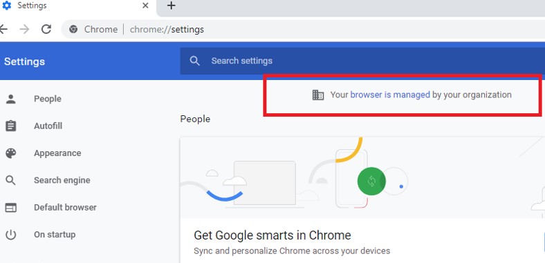 Notice that the Chrome settings page now displays “Your browser is managed by your organization”.