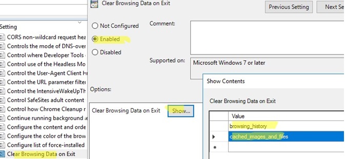 - You can clear Chrome browsing data folders in a user’s profile using the Clear Browsing Data on Exit option; Enable the policy, click Show, and specify which Chrome directories should be automatically cleaned up. Available values:
