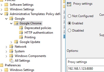 To set proxy server settings for Chrome (may differ from proxy settings in Windows), go to Google Chrome -> Proxy settings – enable the policy and specify the proxy server address and port in the following format – 192.168.1.123:8080