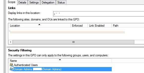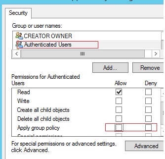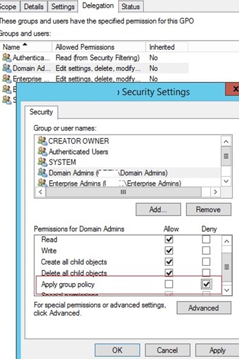 - Go to the Delegation tab and click the Advanced. In the security settings editor, specify that the Domain Admins group is not allowed to apply this GPO (Apply group policy – Deny).