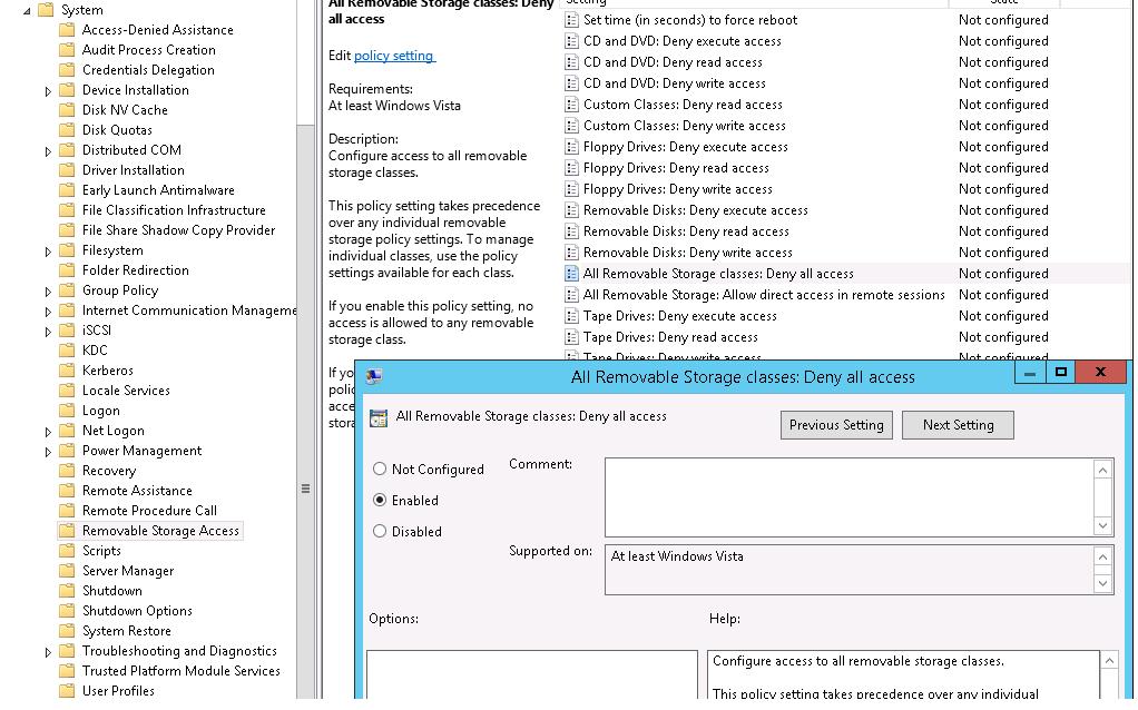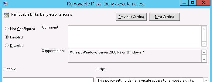 You can implement the “strongest” restrict policy All Removable Storage Classes: Deny All Access to completely disable the access to all types of external storage devices. To enable this policy, open its properties and change from Not Configured to Enabled.