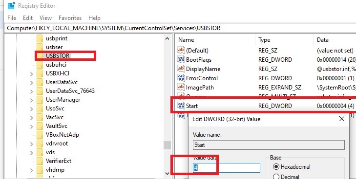 Set-ItemProperty "HKLM:\SYSTEM\CurrentControlSet\services\USBSTOR" -name Start -Value 4