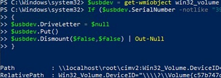 If ($usbdev.SerialNumber –notlike “31DF1233BKAD”)