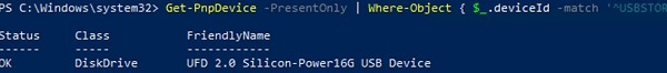 Get-PnpDevice -PresentOnly | Where-Object { $_.deviceId -match '^USBSTOR' }
