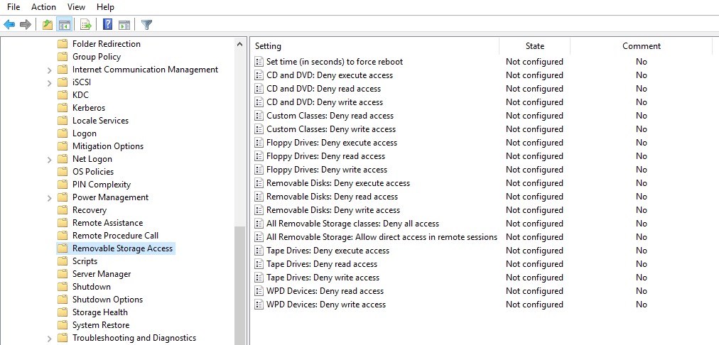 - Computer Configuration -> Policies -> Administrative Templates -> System -> Removable Storage Access.