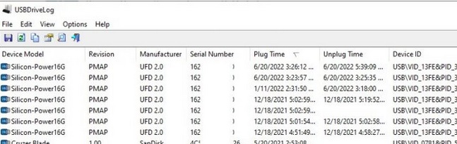 You can also use the free USBDriveLog tool from Nirsoft, which allows you to display the entire history of connecting USB drives to the user’s computer (displays information about the device, serial number, manufacturer, connection/disconnection time, and device id).