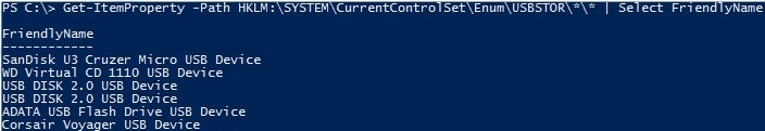 Get-ItemProperty –Path HKLM:\SYSTEM\CurrentControlSet\Enum\USBSTOR\*\*| select FriendlyName