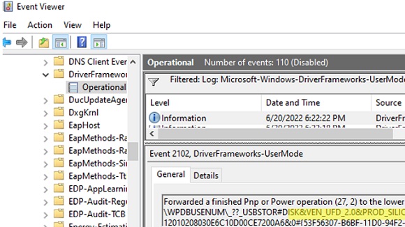- You can find these events in Event Viewer -> Application and Services Logs -> Windows -> Microsoft-Windows-DriverFrameworks-UserMode -> Operational;