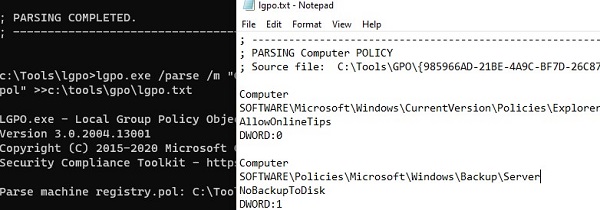 lgpo.exe /parse /m "C:\Tools\GPO\{985966AD-21BE-4A9C-BF7D-26C879982067}\DomainSysvol\GPO\Machine\registry.pol" >>c:\tools\gpo\lgpo.txt