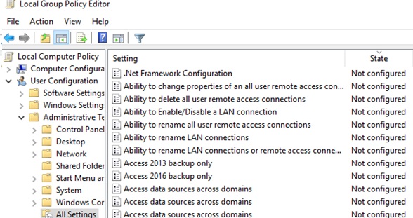 Open the gpedit.mscMMC snap-in and navigate to the All Settings section (Local Computer Policy -> Computer Configuration – > Administrative Templates). This section contains all the options that are available for configuration in the administrative (admx) GPO templates installed on the computer. Sort policies by the State column to find all configured settings (with Disabled or Enabled state).