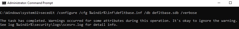 secedit /configure /cfg %windir%\inf\defltbase.inf /db defltbase.sdb /verbose