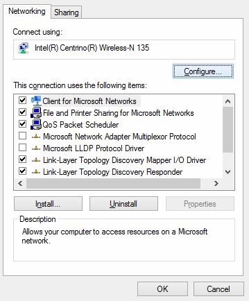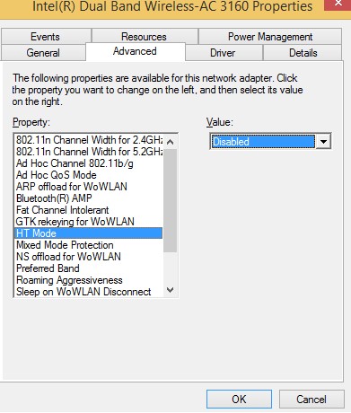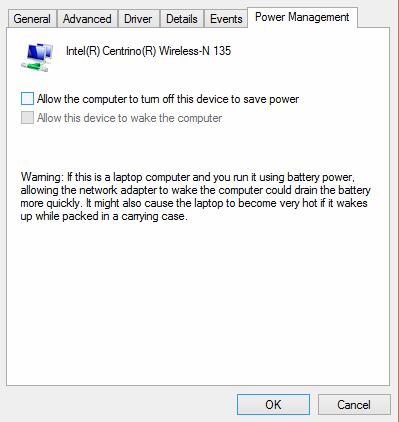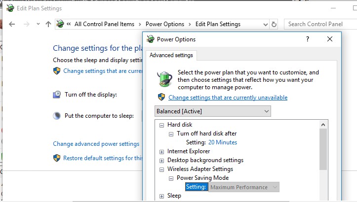 Also, change the power saving mode settings in the system setting. Go to the Control Panel -> Power Options -> for the current power scheme select Change plan settings -> Change advanced power settings -> Wireless Adapter Settings -> Power Saving Mode-> Choose Maximum Performance.