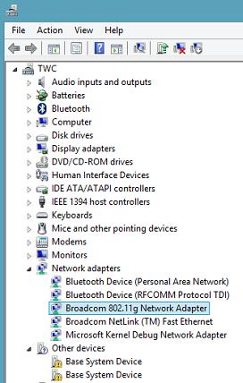 - Expand the branch Network Adapters and find your Wi-Fi card (Broadcom 802.11g in our example).