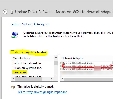 - Uncheck Show compatible hardware. Then find Broadcom in the list, choose the older version of the driver and press Next (the less number corresponds to the older driver version). In our example the older version of the driver is Broadcom 802.11n Adapter version: 5.100.245.200 (the newer one has the index 6.30.223.102). Note. If you use the built-in Microsoft Wi-Fi (WLAN) driver, we strongly recommend that you install the manufacturer’s “native” driver. Universal drivers may see compatibility issues with some wireless network cards.