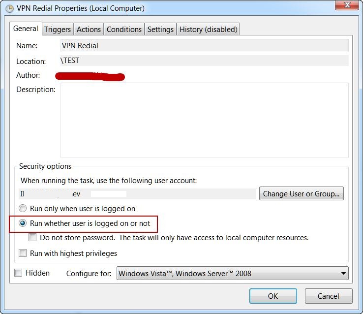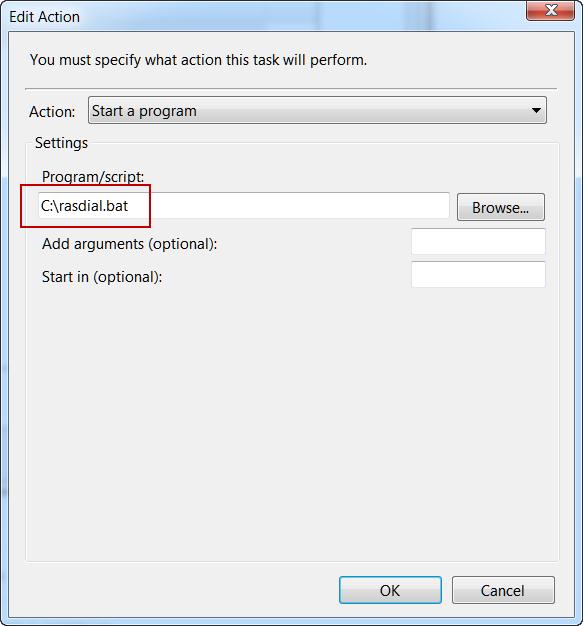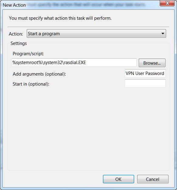 - Select rasdial.exe with the parameters vpn-name username password as a program to be started