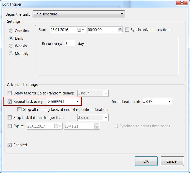 - Set two triggers in the task. The first one will use an XML query (like it has been described in the article “How to Start a Scheduler Task After the Previous Task“)