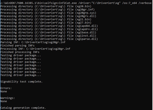 Inf2Cat.exe /driver:”C:\DriverCert\xg20″ /os:10_X86,10_X64 /verbose