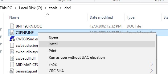 If you right-click on the inf driver file and select Install when installing a driver from File Explorer, you receive an error: