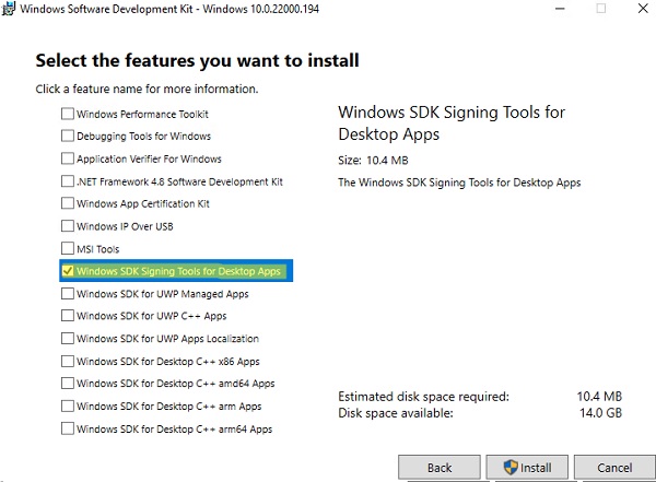 - Windows SDK (Software Development Kit) or Microsoft Visual Studio 2005+ for your Windows version. Install the Windows SDK Signing tools for Desktop package which contains the
