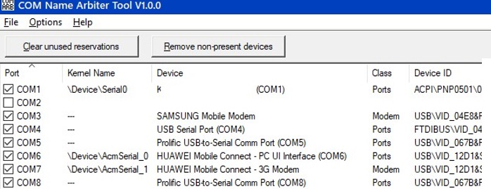 - COM Name Arbiter Tool – this tool can help you to reset COM port reservations and find the used COM port numbers. Download the tool and run it as an administrator. Select the COM ports you want to release and click Clear unused Reservations and Remove non-present devices;