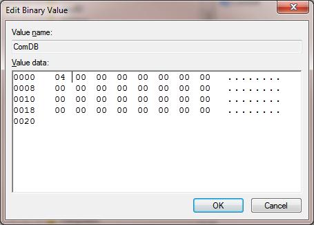 regedit.exe) and go to the registry key mentioned above;Important! We strongly recommend you to backup this registry key (File -> Export) before doing anything. If something goes wrong, you can restore the original COM port configuration. - The value of ComDB parameter in the binary format determines the list of COM ports reserved in Windows. Each bit determines the state of the corresponding port (from 1 to 255). For example, if you need to leave the reservation only for COM3, the hex value of ComDB will be equal to 04 (0000 0100); Important! Be very attentive, and don’t add any additional bits to the parameter, or the system will start to fail into a BSOD.