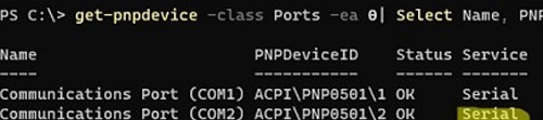 get-pnpdevice -class Ports -ea 0| Select Name, PNPDeviceID, Status, Service
