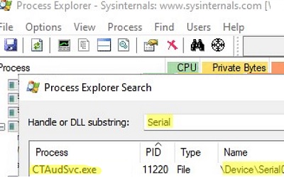 The service name of the specific COM port is shown in the Service column. For example, for COM2 it is Serial. Now you need to run Process Explorer as an administrator and select Find -> Find Handle or DLL from the menu. In the Handle or DLL substring line, enter the Service value obtained earlier. In our example, this is Serial .